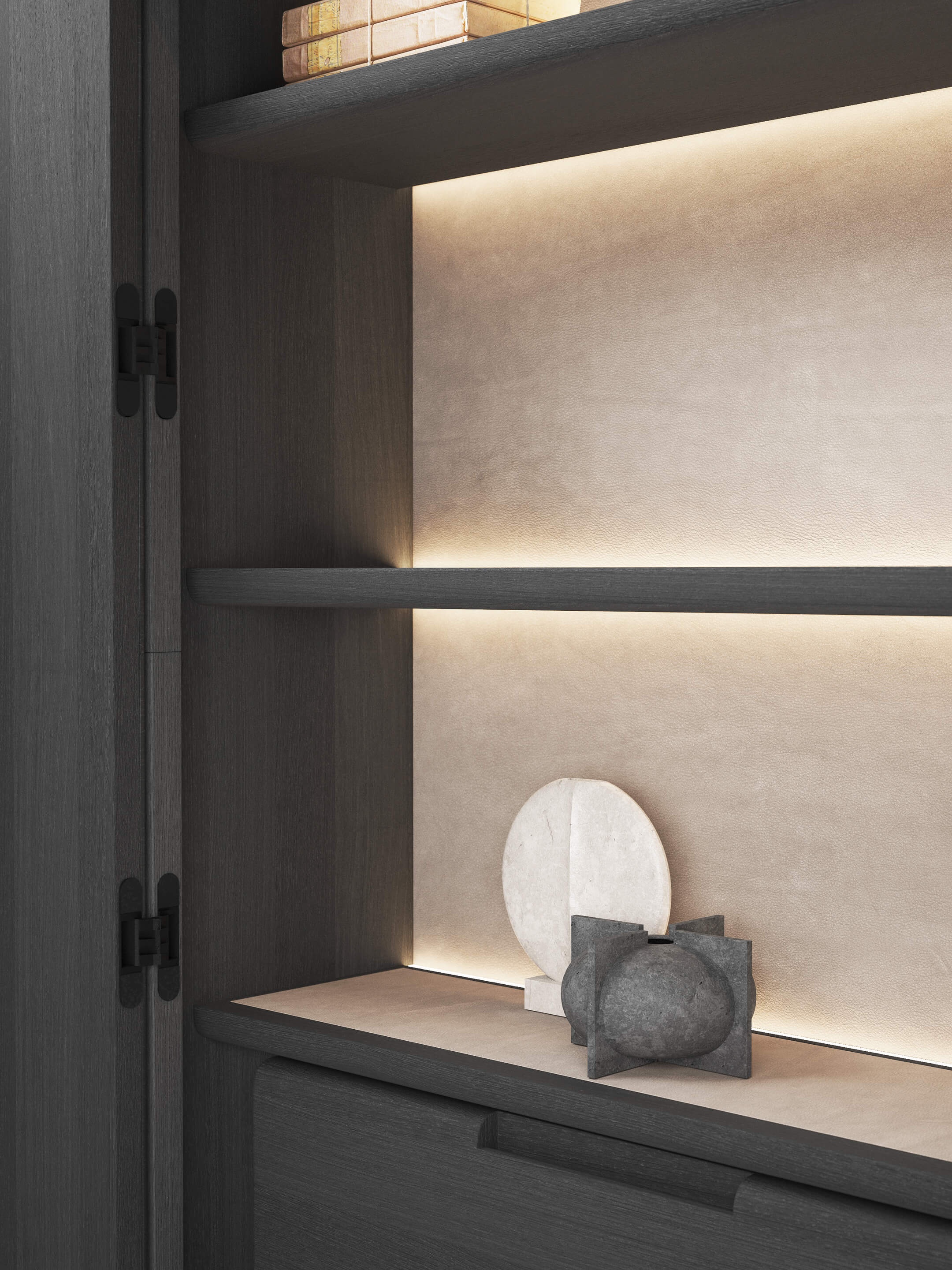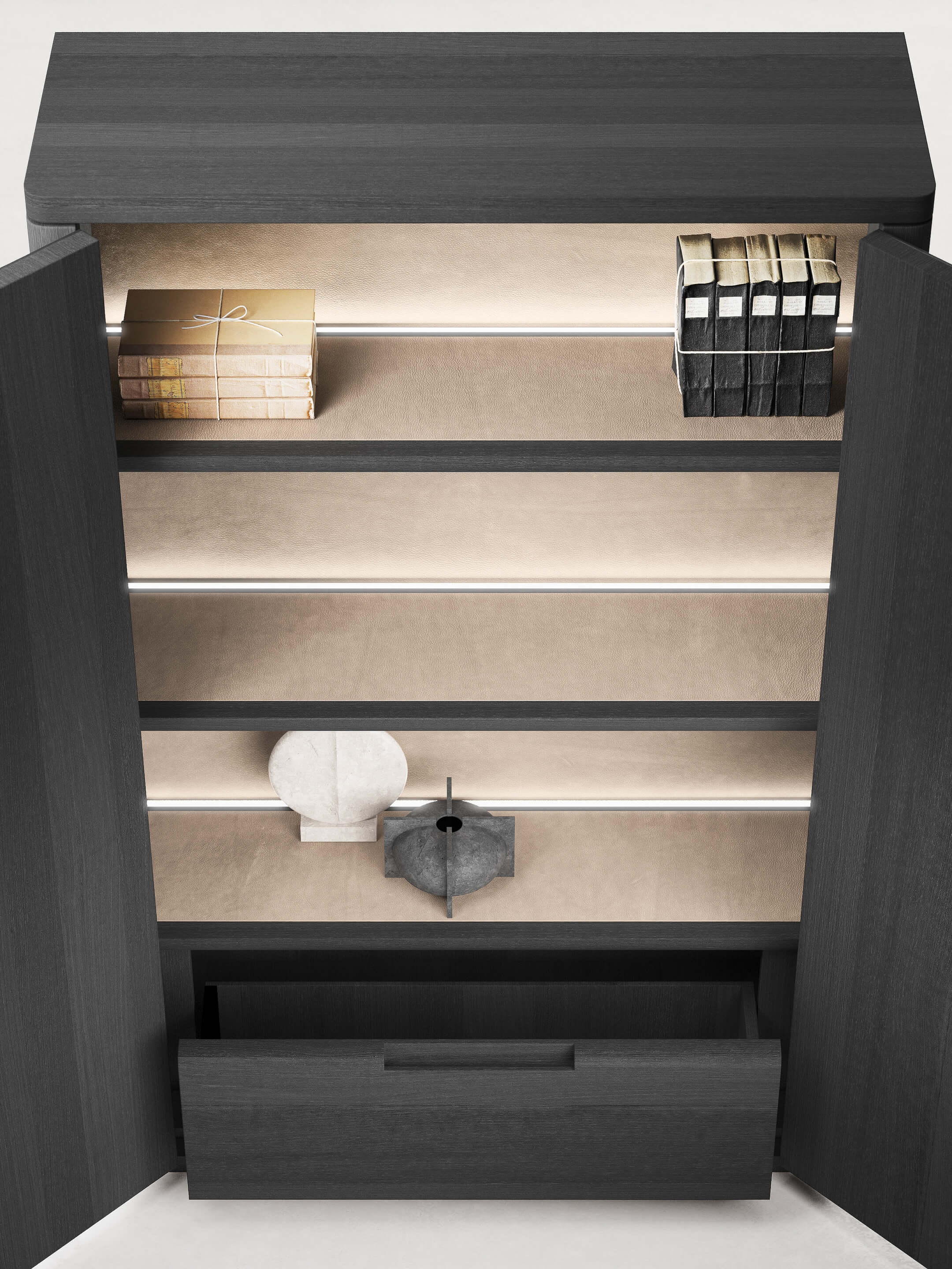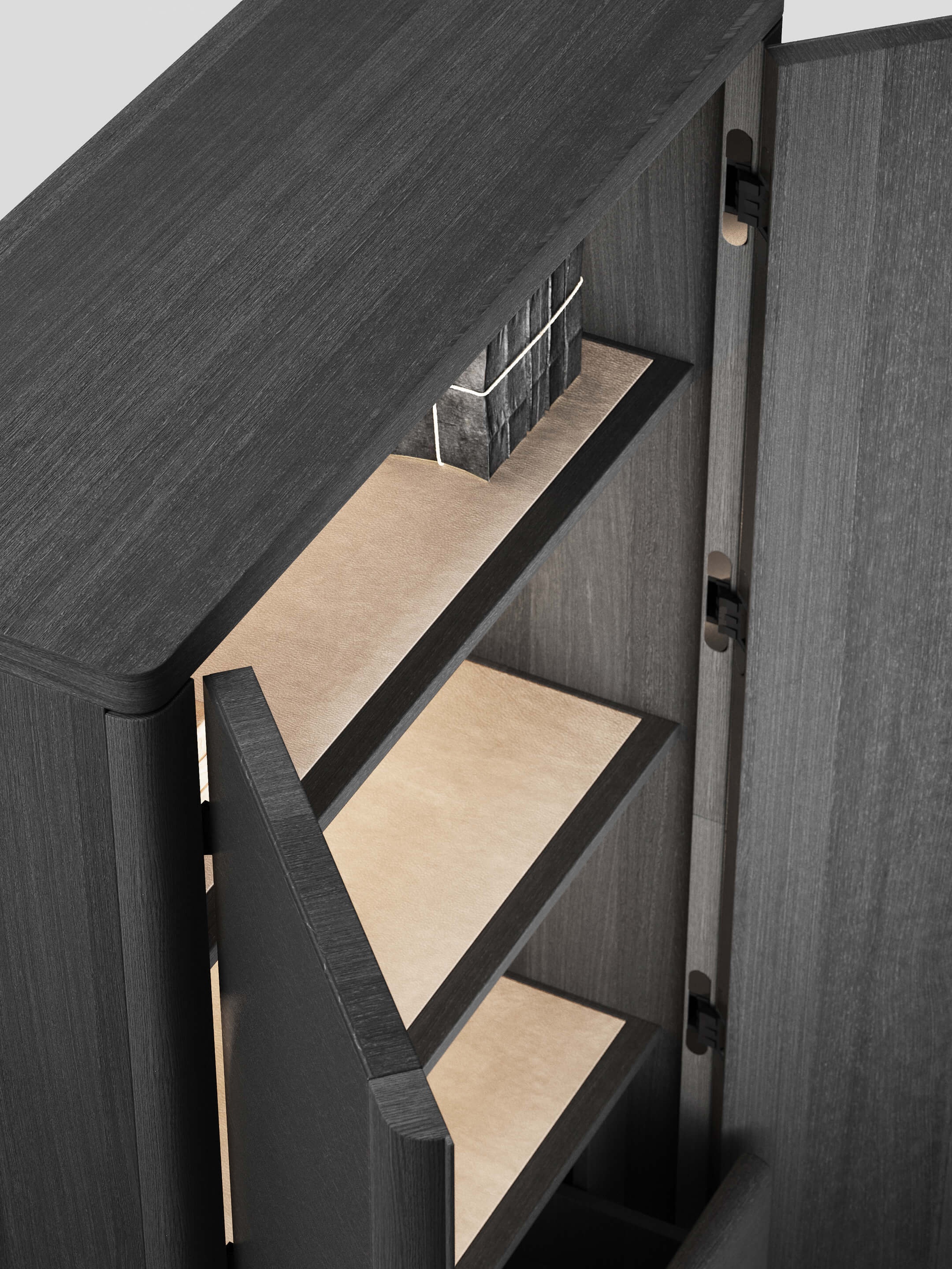 The result is austere and rigorous furniture, softened by the wood’s smoothness, which is flame-treated to bring out the grain in a materiality that can only be achieved with solid wood.