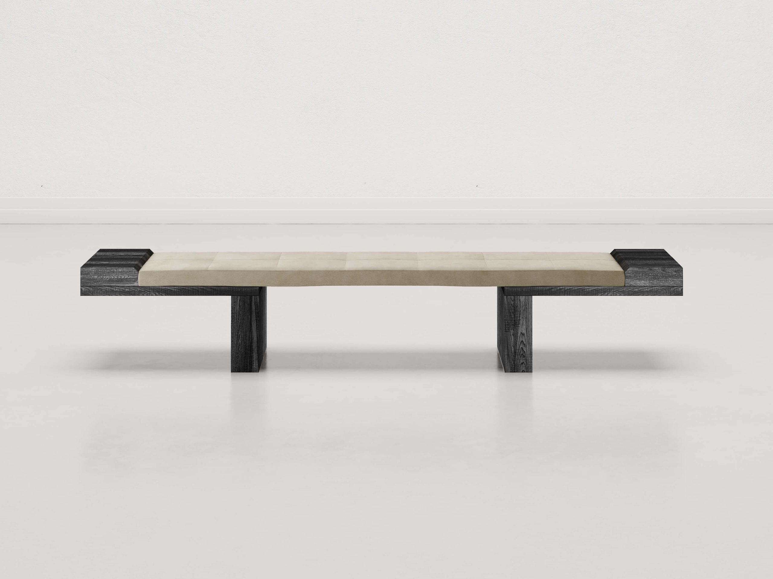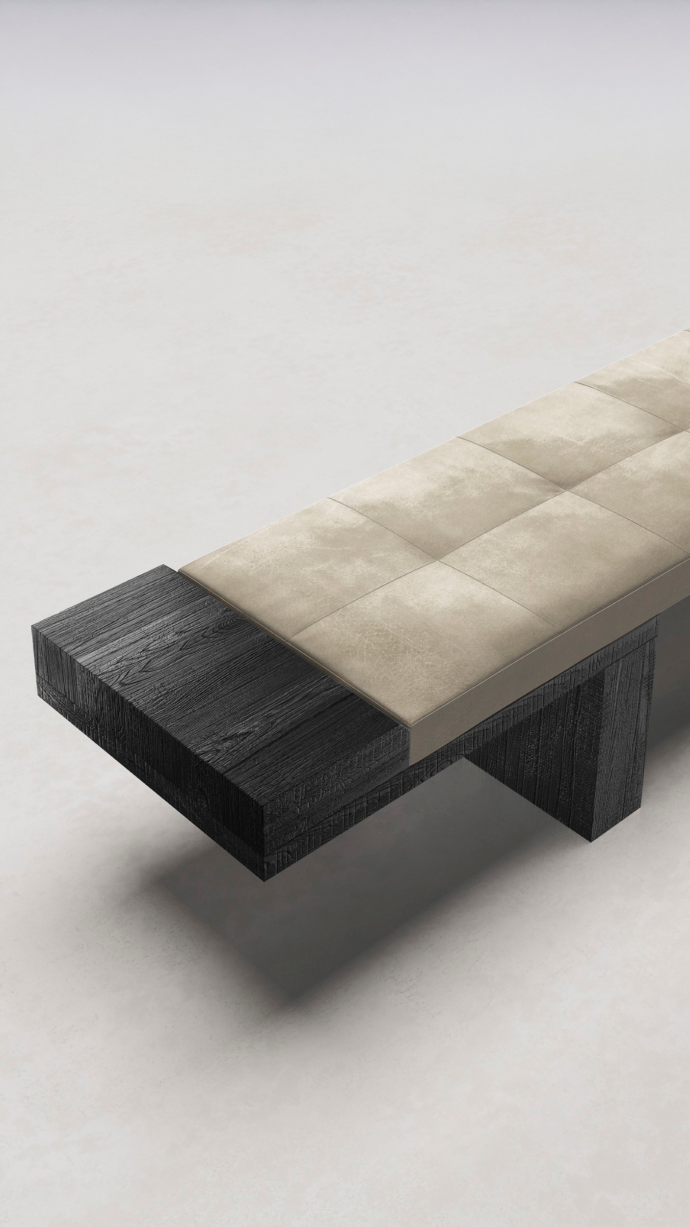 The bench “After All” embodies pure material inspiration throughout. River fir, in all its natural, rough beauty, hosts a padded leather seat, characterized only by a visible double-stitch seam reminiscent of capitonné, but without buttons.