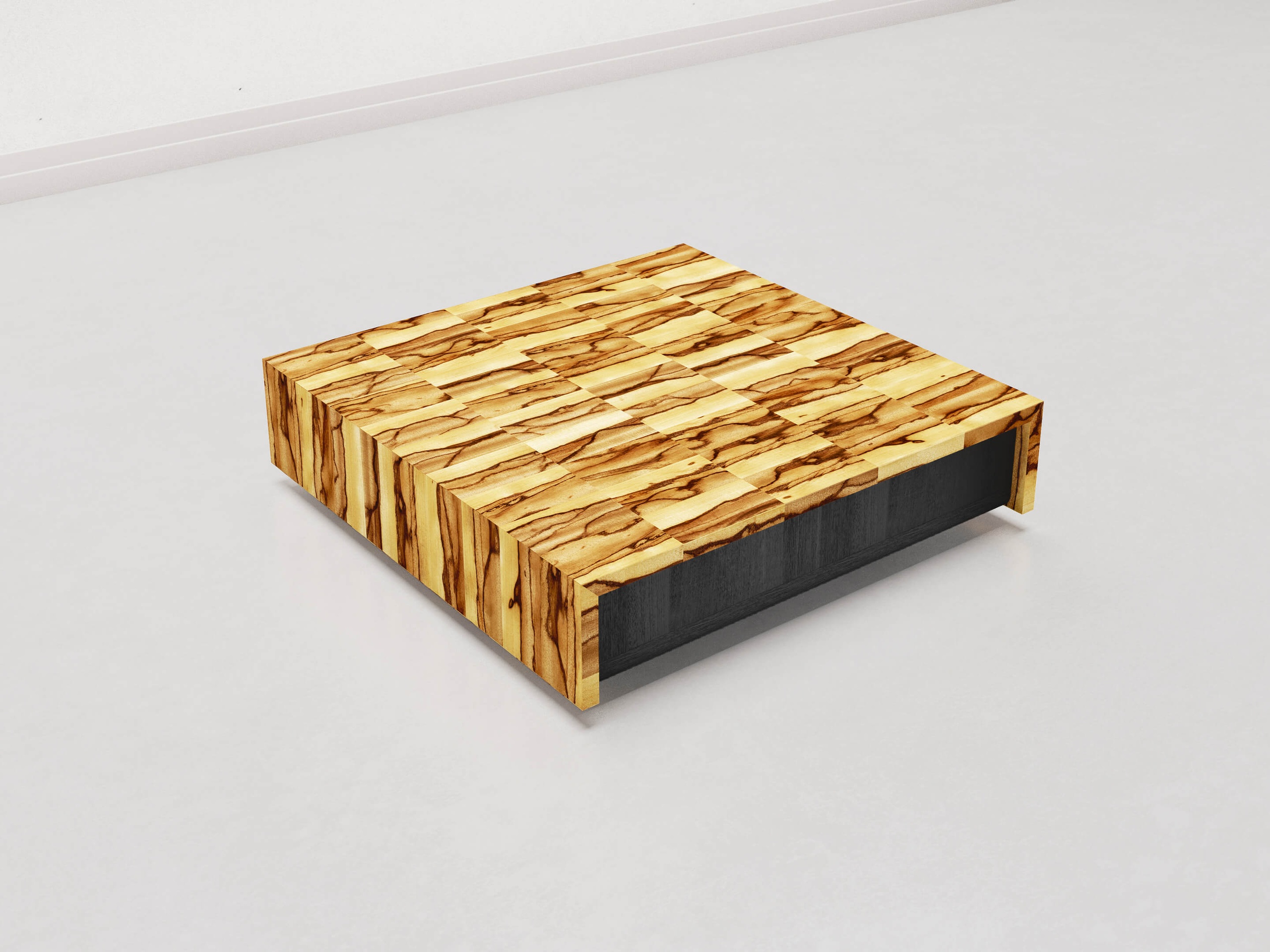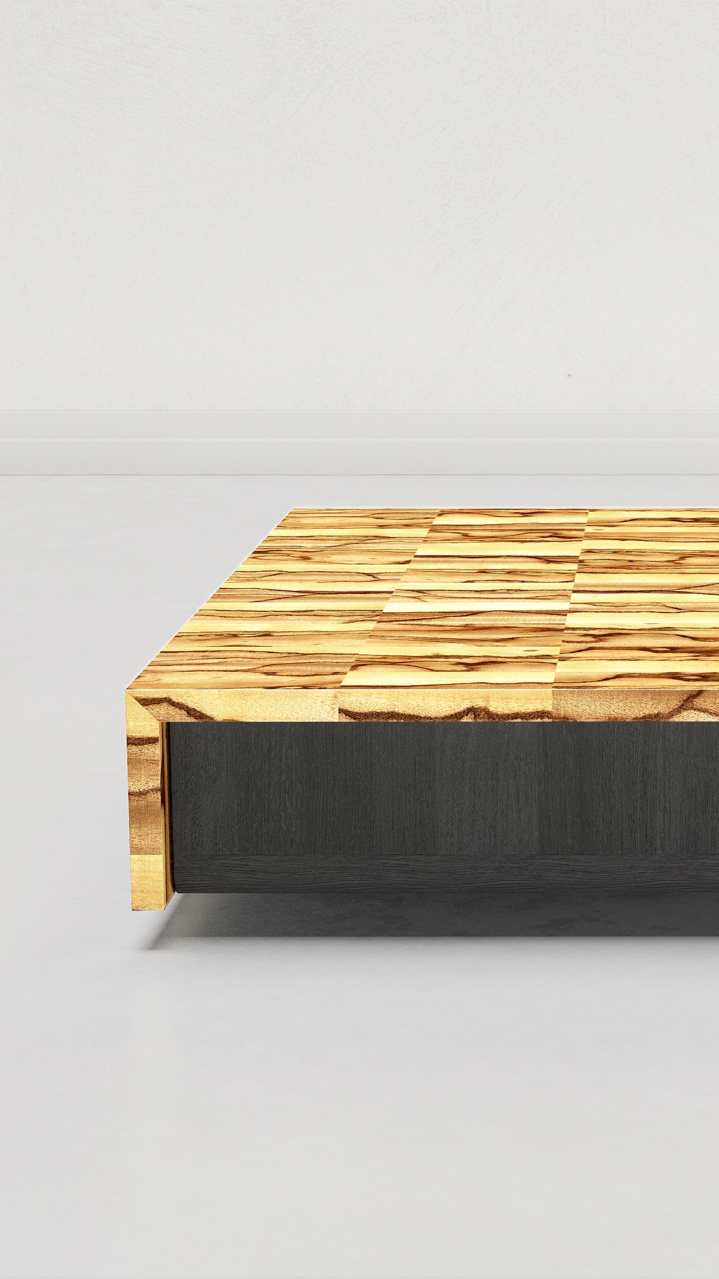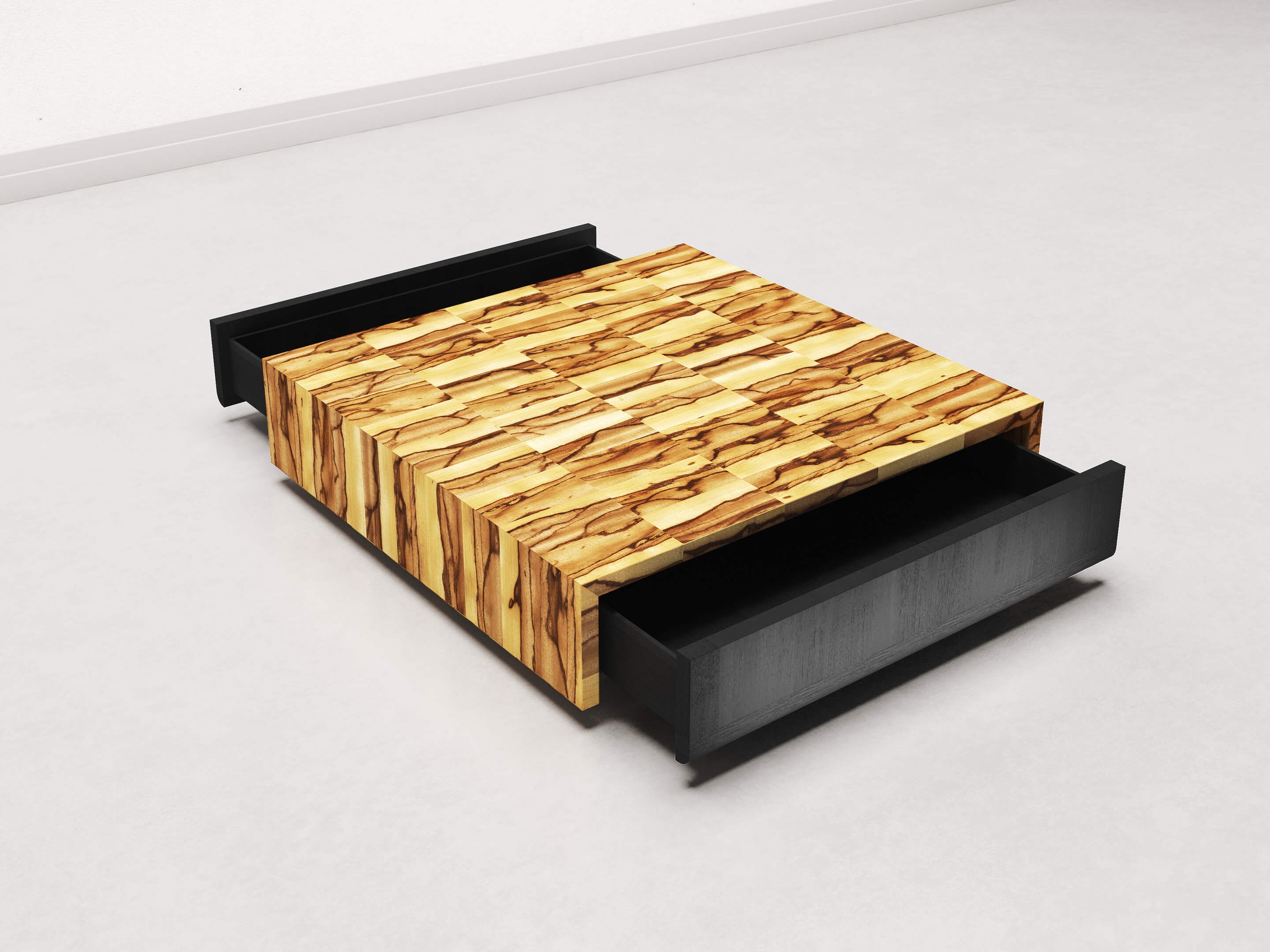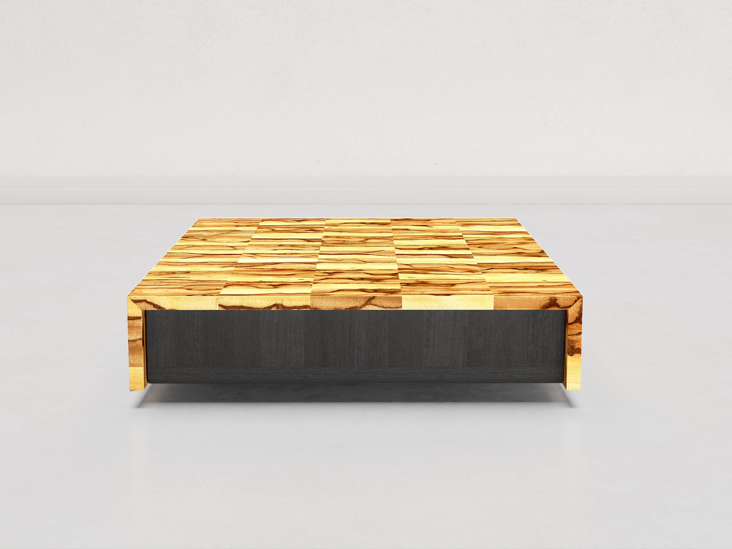 We use selected wooden pieces, cut and assembled with mastery to create a veneer sheet that becomes more than just a simple surface, it becomes a story written on the wood itself. The finishing process is equally meticulous: five layers of varnish, each applied with care and left to dry for three days, giving the objects an ethereal shine.