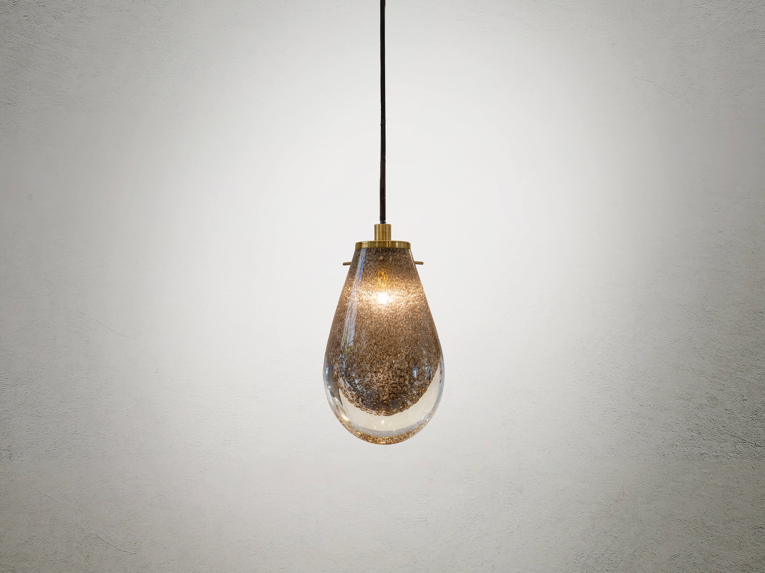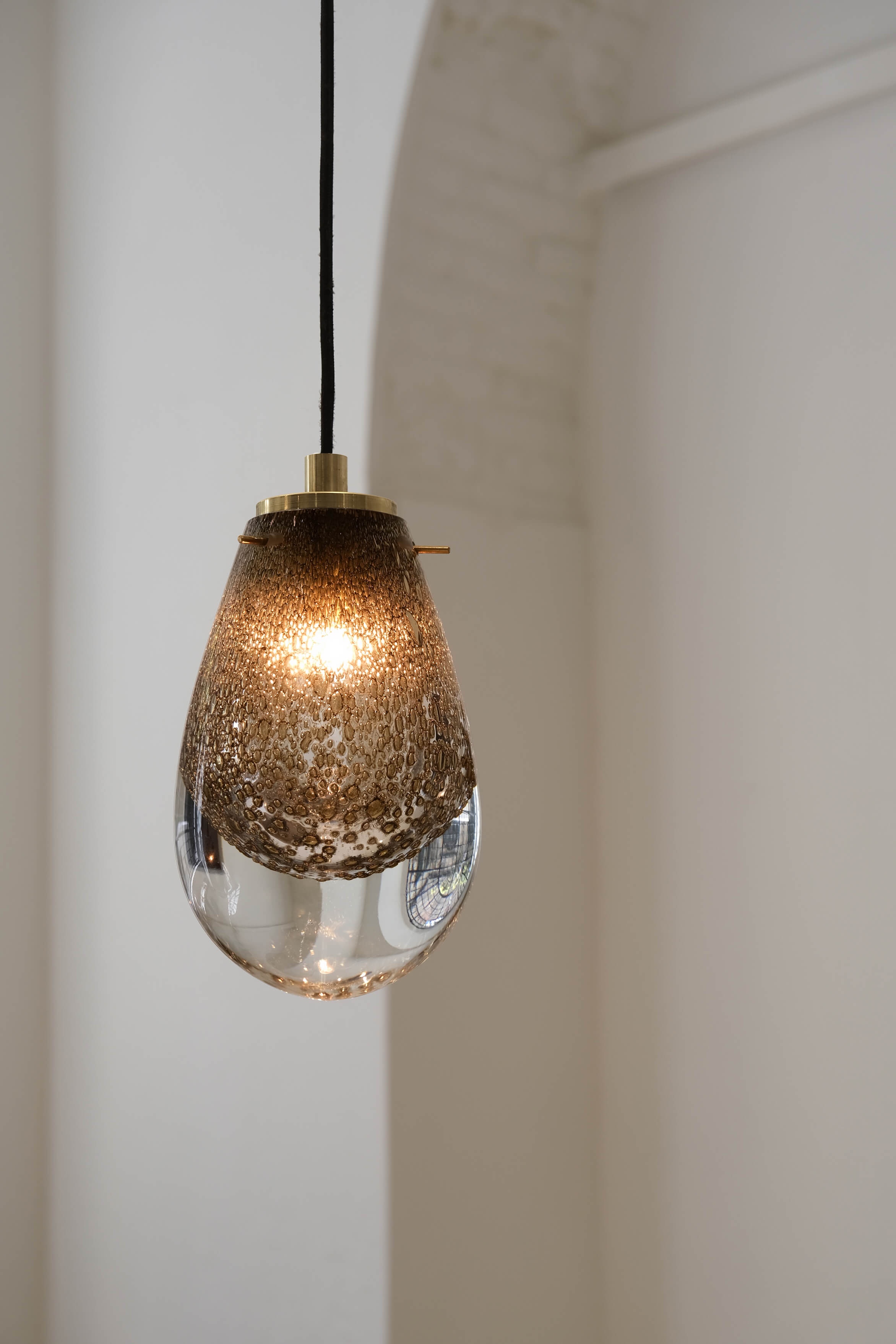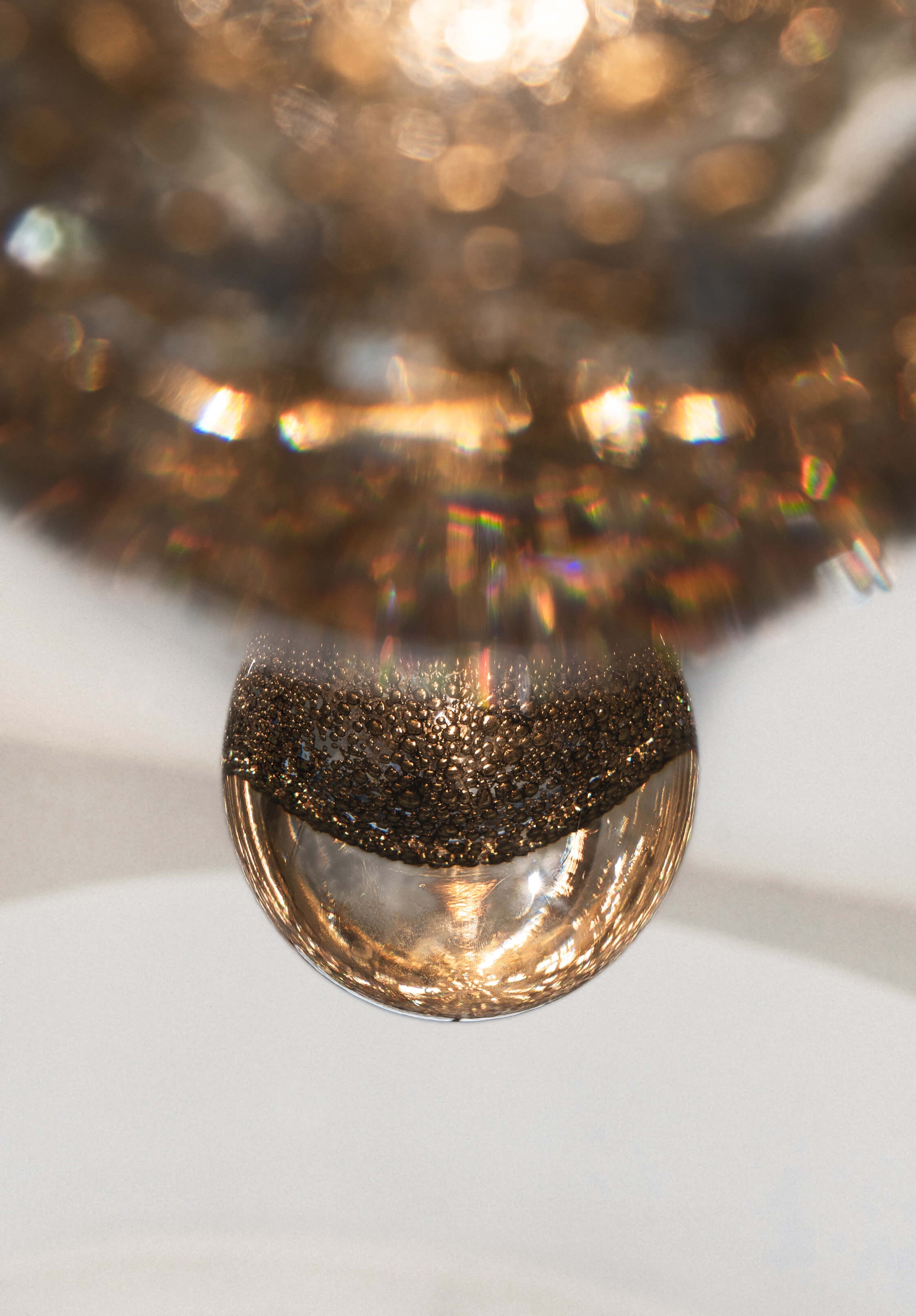 The process begins with a layer of blown glass covering a smaller internal sphere, akin to a delicate embrace. Then, the glass is placed on a platform and immersed in brass dust debris, which adheres to the surface like precious memories that shape our essence. This layer of glass is then manually sculpted, taking on the form of a droplet, symbolising rebirth and transformation. During this phase, the heat triggers a reaction with the brass, trying to burst out while remaining trapped between the layers of glass, forming bubbles that float within it.
