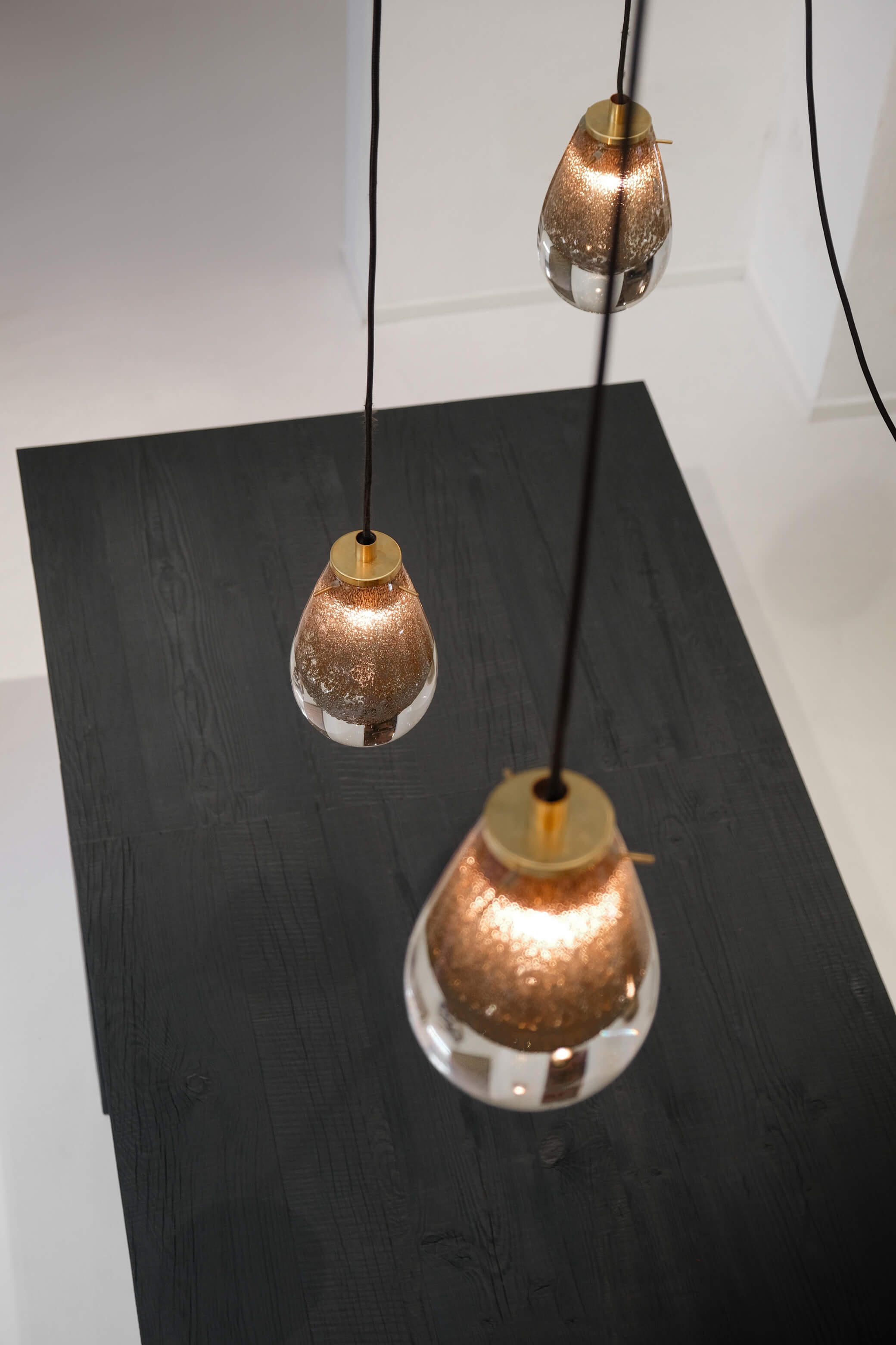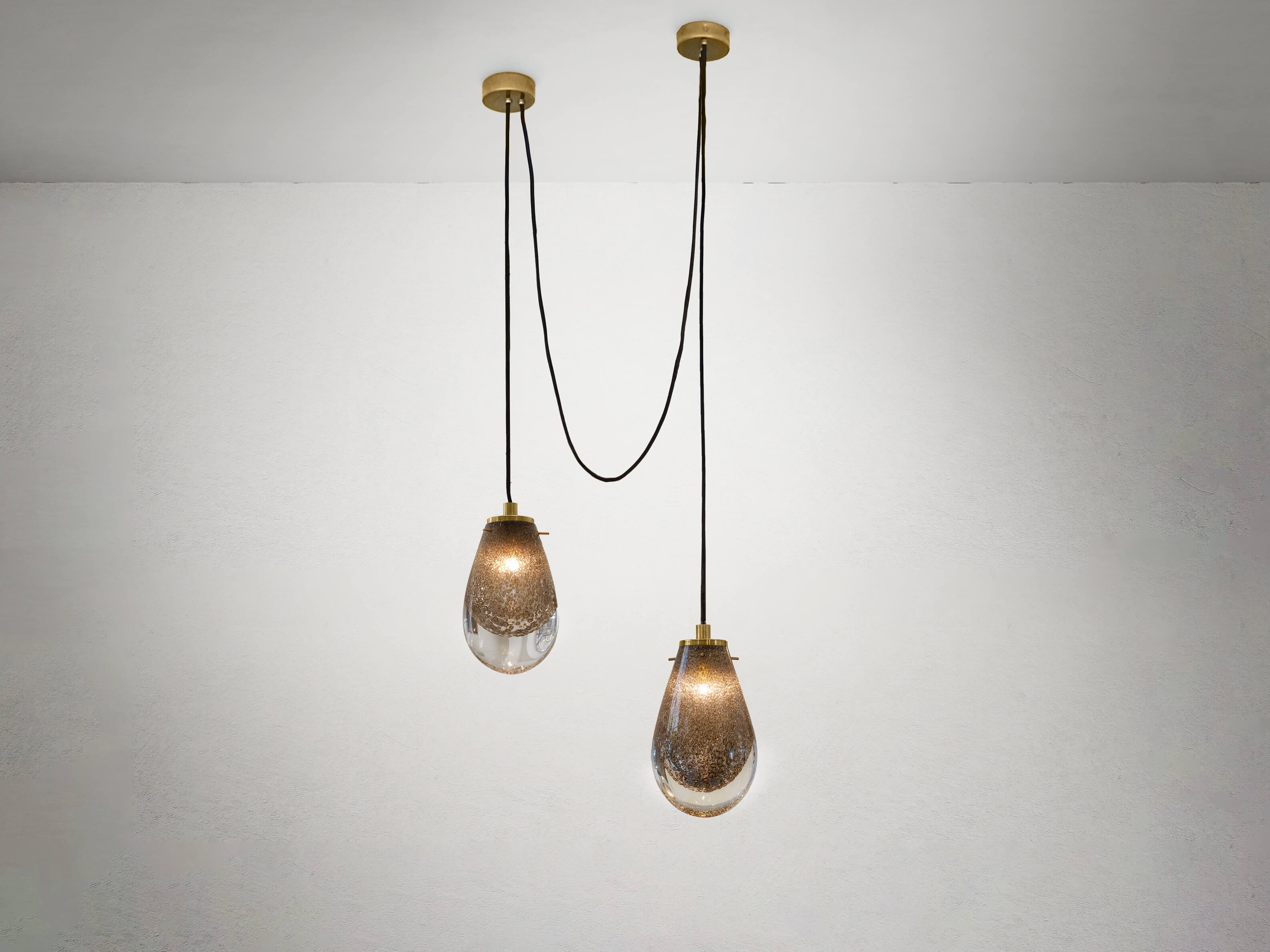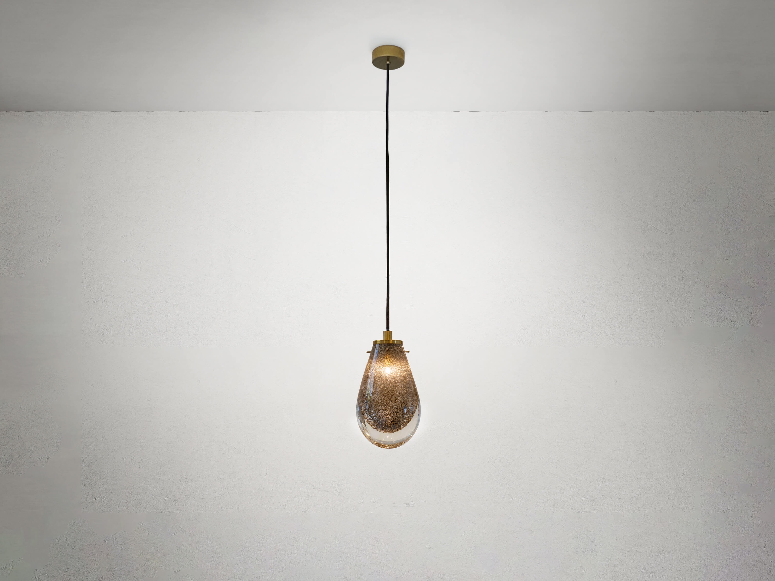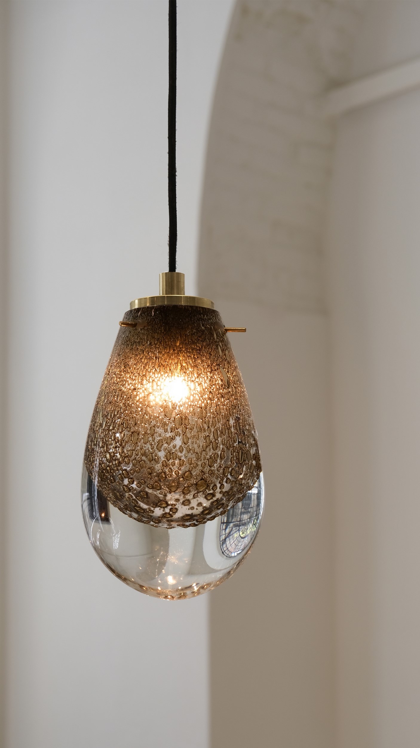 The process begins with a layer of blown glass covering a smaller internal sphere, akin to a delicate embrace. Then, the glass is placed on a platform and immersed in brass dust debris, which adheres to the surface like precious memories that shape our essence. This layer of glass is then manually sculpted, taking on the form of a droplet, symbolising rebirth and transformation. During this phase, the heat triggers a reaction with the brass, trying to burst out while remaining trapped between the layers of glass, forming bubbles that float within it.