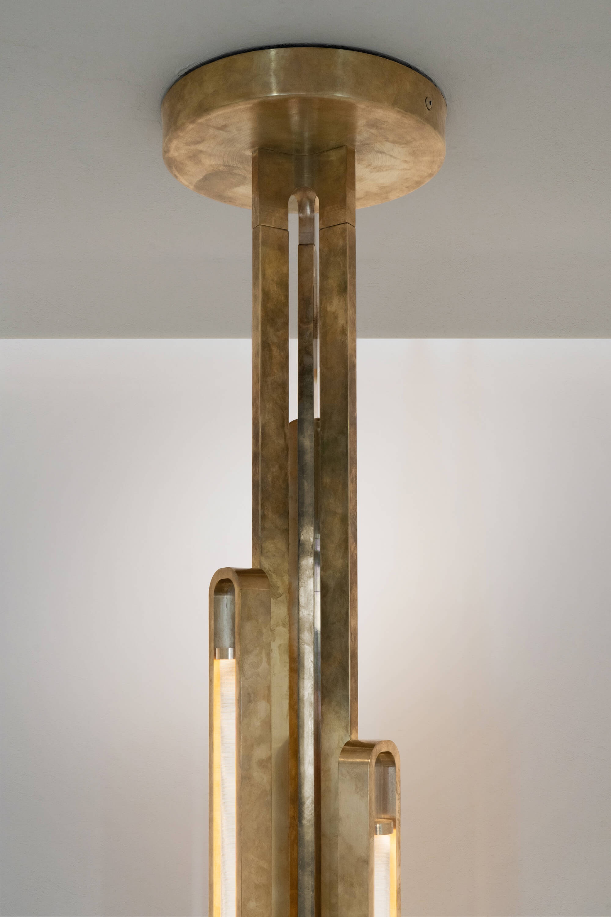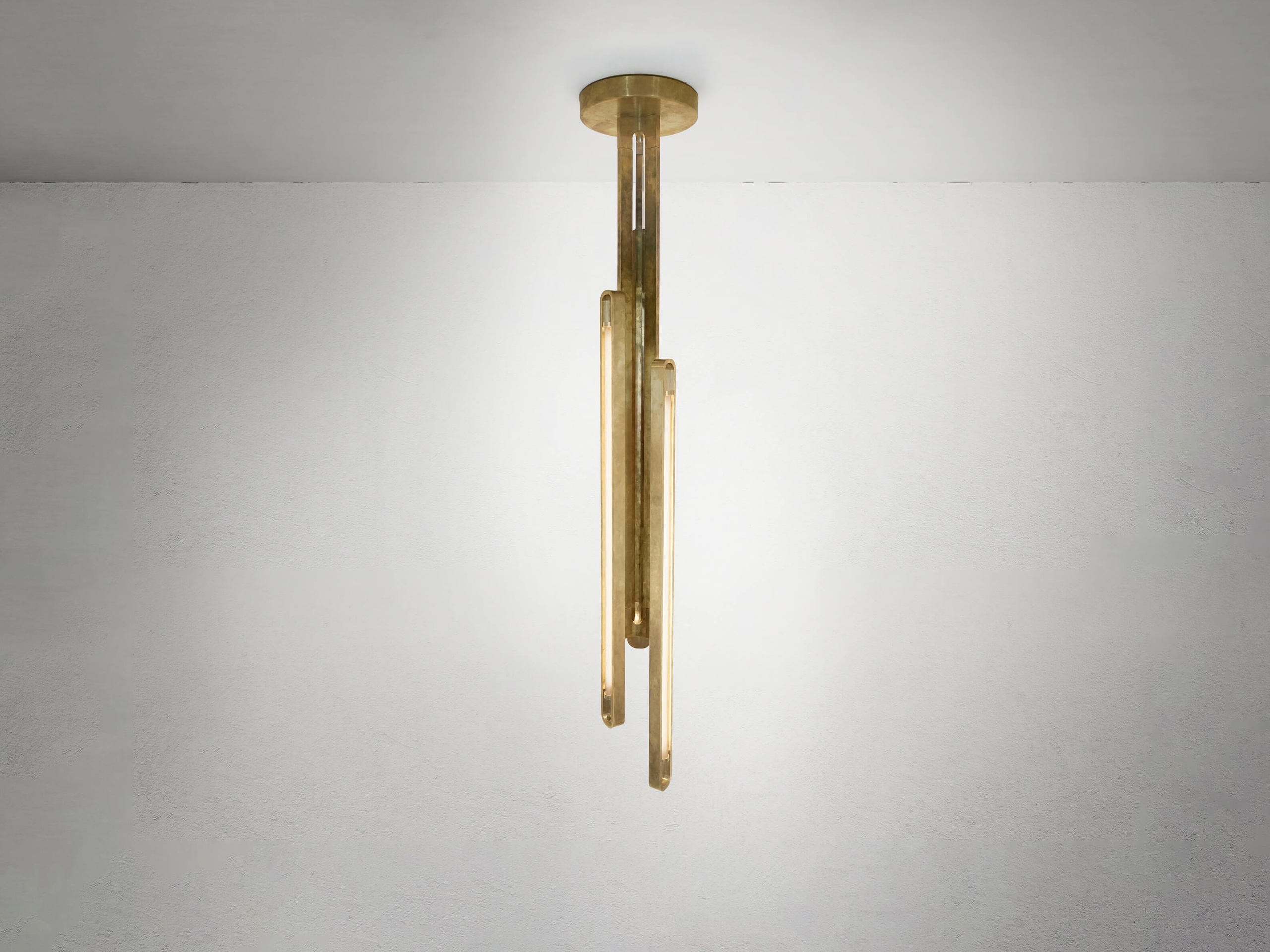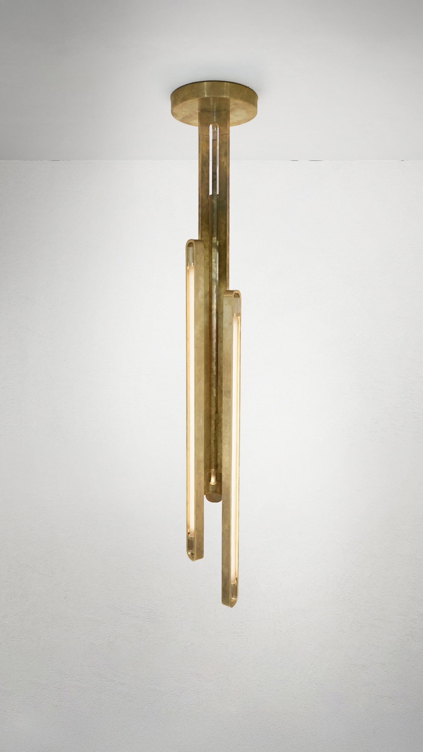 Crafted entirely from solid brass, each element radiates a potent and unmistakable energy, evoking the rebellious spirit of rock ‘n’ roll. The polycarbonate tube is encased in fabric, creating a contrast with the solidity of the brass. The light diffuses, casting an aura of warmth and intimacy. An invitation to explore the darkest and most mysterious nuances of our soul.